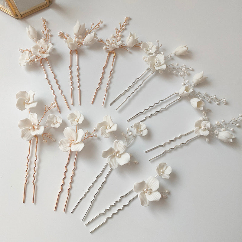 Elegant Ceramic Flower Crystal Glass Pearl Hair Comb and Pin Bride Wedding Jewelry Hair Accessories