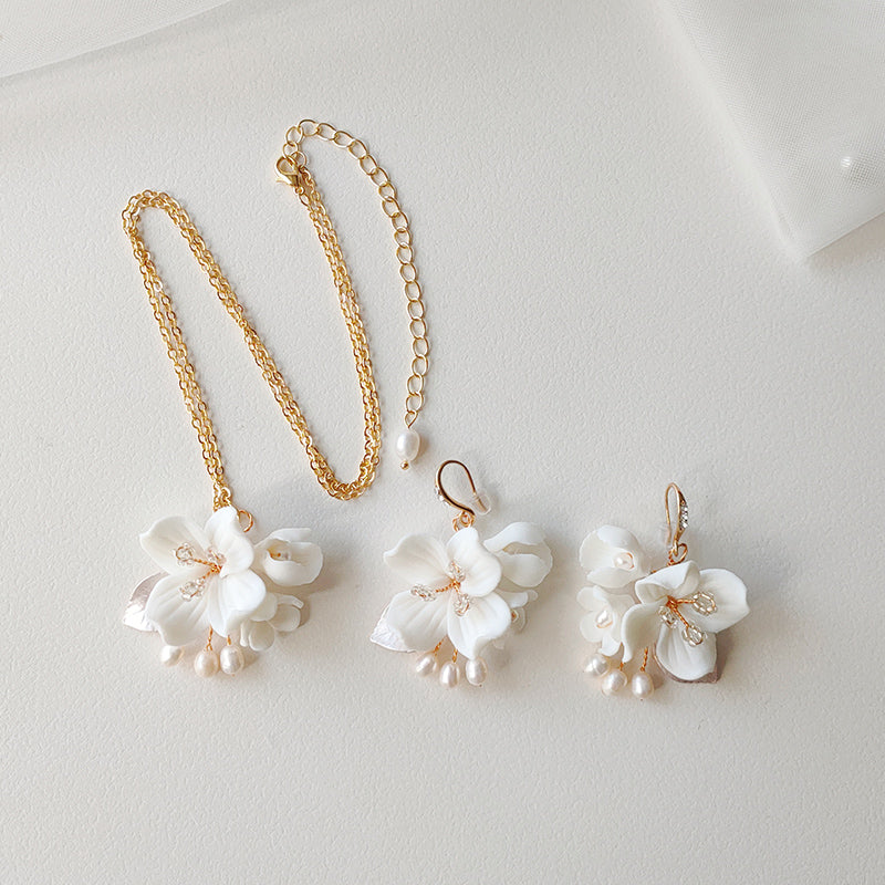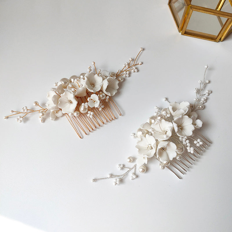 These garden inspired floral hair pins with delicate ceramic flower with freshwater pearl sprays. Wear them scattered in a perfectly imperfect bun.