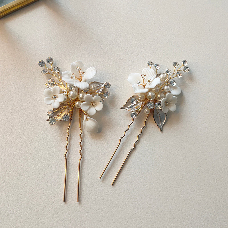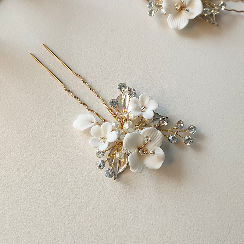 This hair pin set feature ceramic flower with pearl and rhinestone is perfect for country, and garden-inspired weddings, creating an effortless and romantic vibe. Opt for the whisper hair pins for they’re feminine and whimsical. These pins feature various blooming flowers perfect for a half-up or romantic updos.