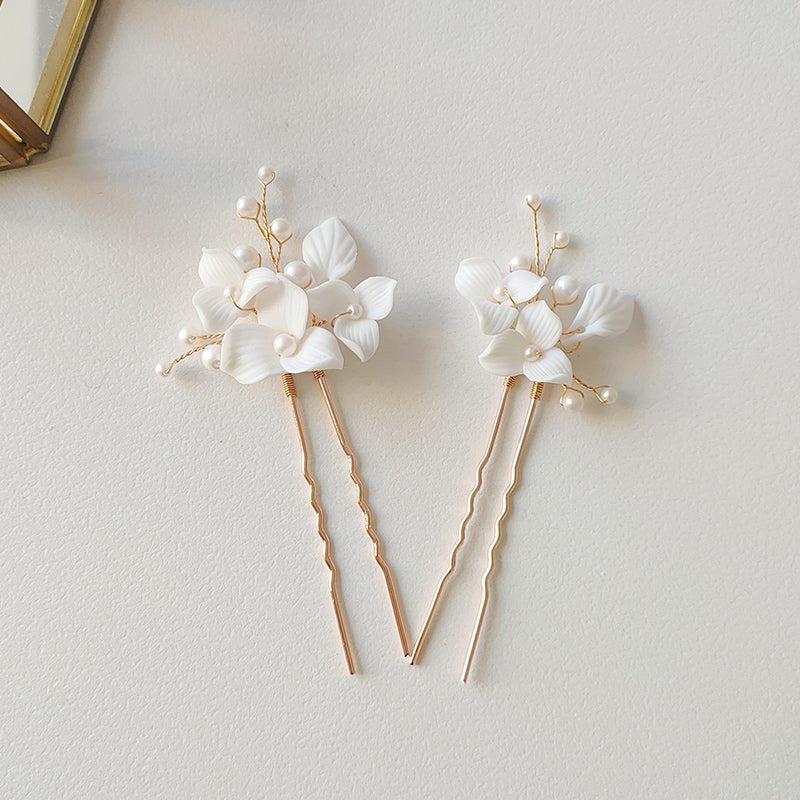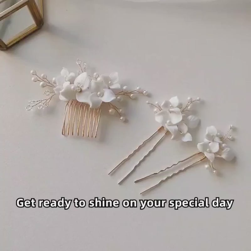 Enhance your bridal elegance with this enchanting &elegant hair comb and pin set, beautifully adorned with handcrafted white ceramic flowers and ceramic leaves,with frosted glass pearl decoration.This exquisite accessory adds a touch of romance and sophistication, making it the perfect finishing touch for your special day.