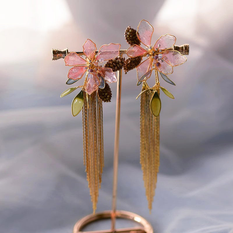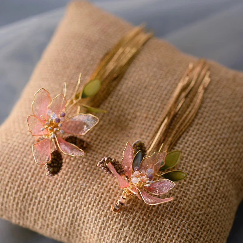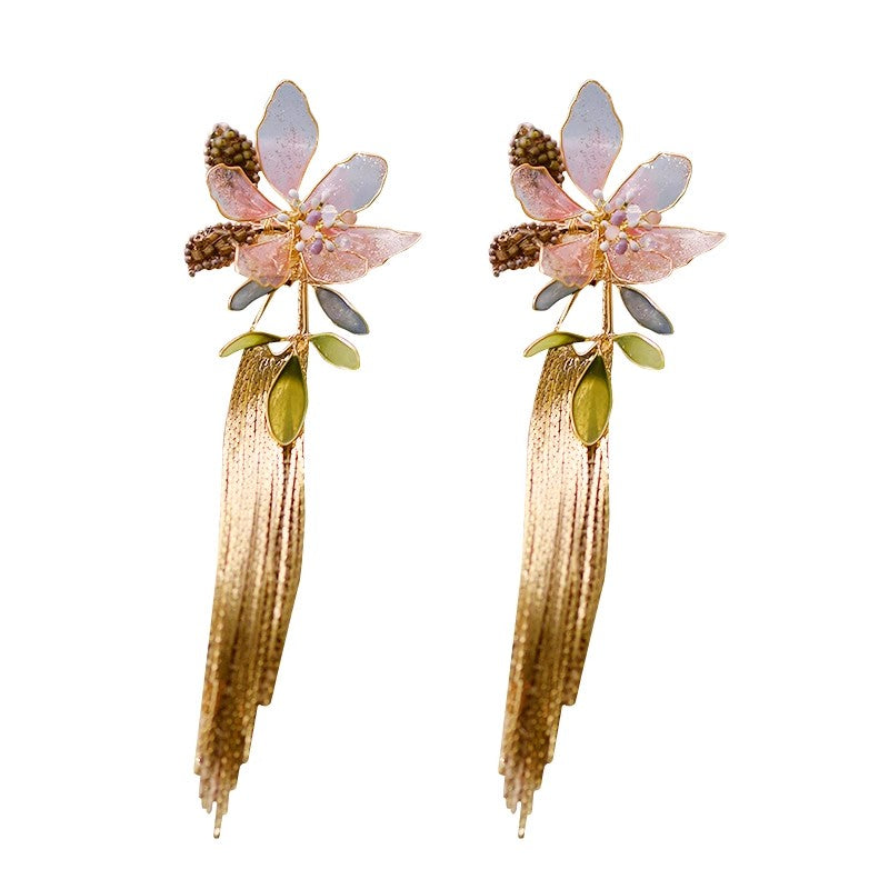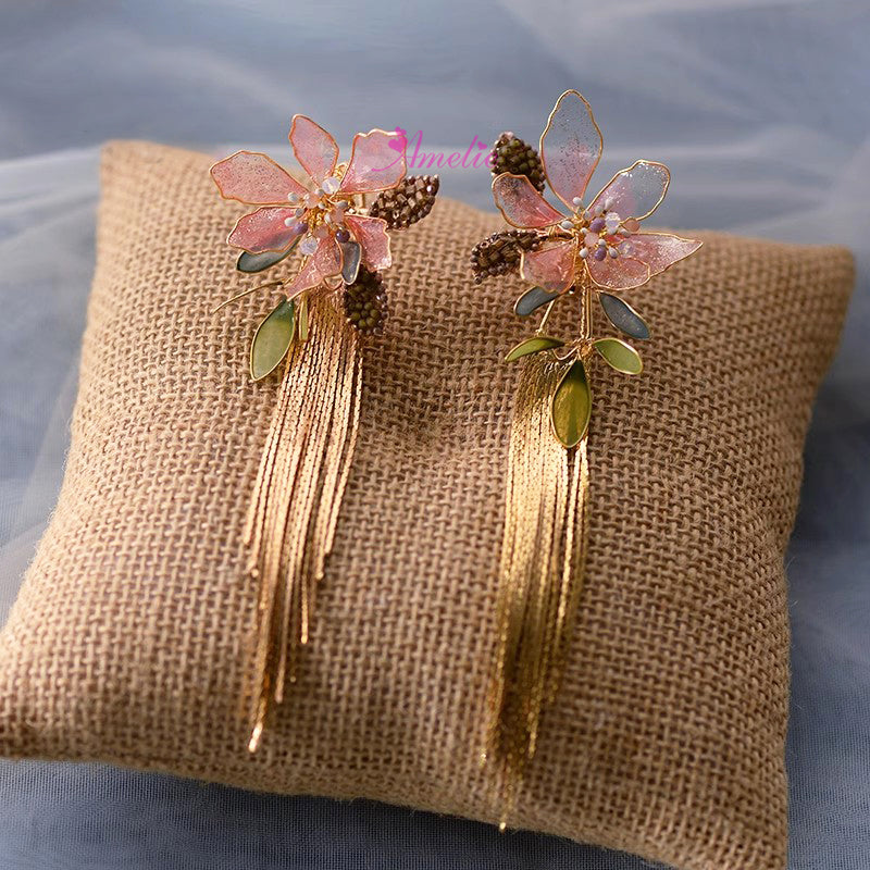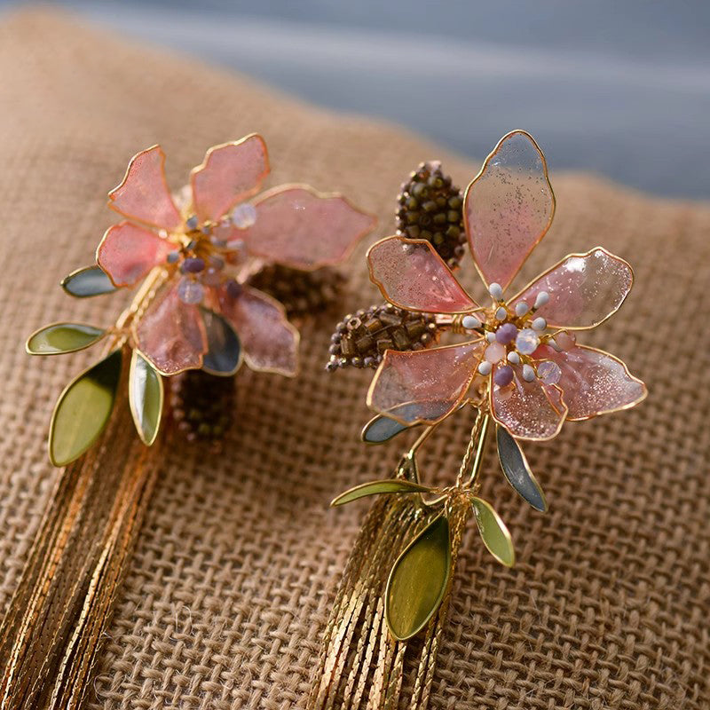 Featuring blooming pink flowers with hints of gold, these vintage, delicate earrings will captivate you. Indulge in elegance with these stunning, handcrafted earrings. Each pair is adorned with charming pink flowers and a touch of gold for a vintage, delicate look that is sure to enchant.